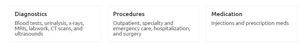 - Exam fees, dental illness, prescriptions included.